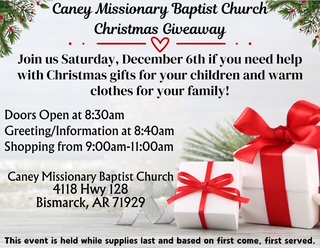 🎁 Community Christmas Give-Away — This Saturday! 🎄Caney Missionary Baptist Church will be blessing members of our community this Saturday, December 6th, by providing free toys and warm clothing for...